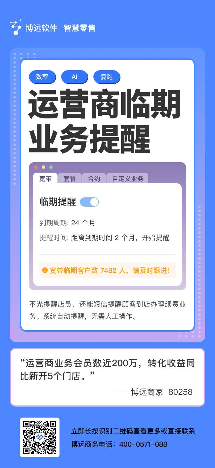 4、临期提醒:业务到期进行自动提醒,可灵活设置提醒时间,轻松应对各类运营商业务营销;