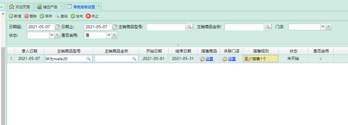 2、点击新增按钮,在新增明细行中,选择主销商品型号或者商品全称,选择搭售规则开始和结束日期,下拉选择搭售规则,点击保存按钮进行保存